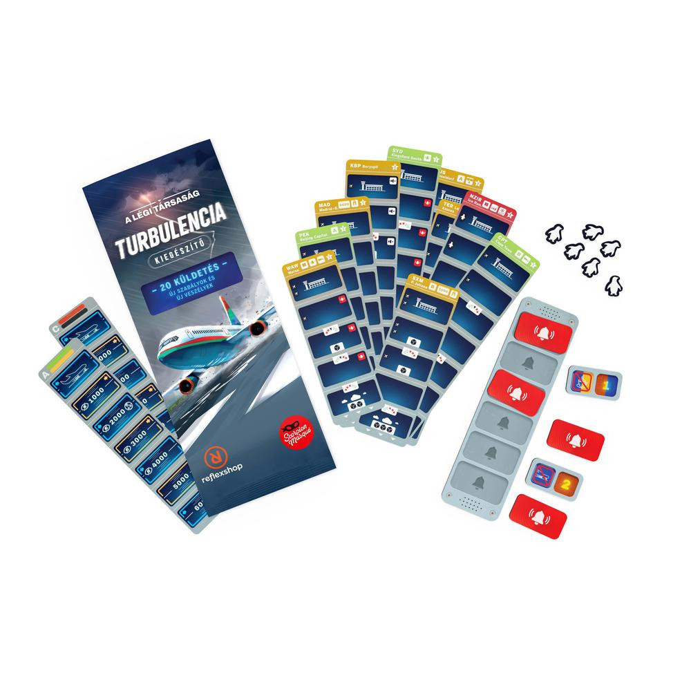 A légi társaság: Turbulencia kiegészítő új kihívások elé állít, ahol a legügyesebb pilóták mérhetik össze tudásukat. Ülj vissza a pilótafülkébe, és nézz szembe a zord időjárással és technikai problémákkal! Ezzel a díjnyertes társasjáték kiegészítővel a repülés még sosem volt ennyire rázós. Kapcsoljátok be a biztonsági öveket, mert rázós út következik! Most lehetőségetek lesz megmutatni, mire vagytok képesek, amikor a körülmények ellenetek dolgoznak. A Turbulencia új szabályokat és modulokat vezet be, mint a gyenge látási viszonyok, riasztások és turbulencia. Frissítsd a játékodat például a következő elemekkel: