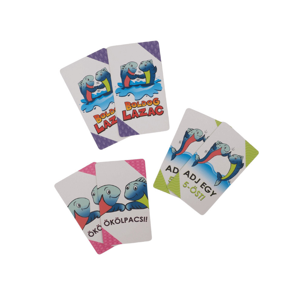 Szabadulj meg a kártyáidtól egyszerűen a Boldog Lazac játékban! Csak hajtsd végre a kártyáidra írt feladatokat egy másik játékossal: pacsizzatok, cseréljetek helyet vagy viselkedjetek ficánkoló lazacként! Ez a parti játék minden korosztálynak garantált szórakozást nyújt. Vajon milyen egy Boldog Lazac? Próbáld ki, és 2 perc alatt megtudod! A játék menete: mindenki egyszerre felolvassa a kártyáját, majd ha két játékosnak megegyeznek a lapjai, végrehajtják a feladatot és eldobják a kártyát. Az nyer, akinek először elfogynak a lapjai. A játék tartalma: