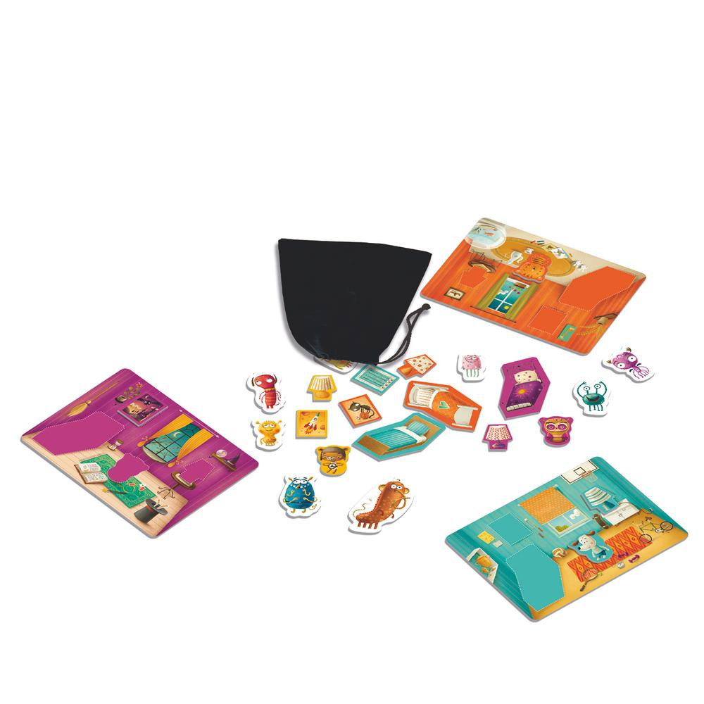 Ismerős a káosz lefekvés előtt? A gyerekszobában eluralkodik a rendetlenség, és a lefekvés előtt még mindig játékok hevernek szanaszét. A feladat egyszerű: minden tárgyat el kell rendezni a gyerekszobában, de vigyázat, mert itt-ott szörnyek is rejtőzhetnek! A játék során a gyerekek a húzózsákból kihúzott tárgyakat helyezik el a játékos táblájukon. Az érintés alapján kell az alakzatokat felismerni, és a megfelelő helyre illeszkedő mezőt megtalálni. Néha azonban szörnyek bukkannak fel – az alakzatuk szinte ugyanaz, mint a többié, de mégsem teljesen azonos. Ha szörnyet húzol, minél gyorsabban szabadulj meg tőle, hiszen senki sem szeretne szörnyeteggel elaludni! Játszhatóság: 2-4 fő számára készült, körülbelül 15 perces játékidővel, és már 3 éves kortól élvezhető. A játék csak német, olasz, francia és spanyol nyelvű szabályokat tartalmaz.