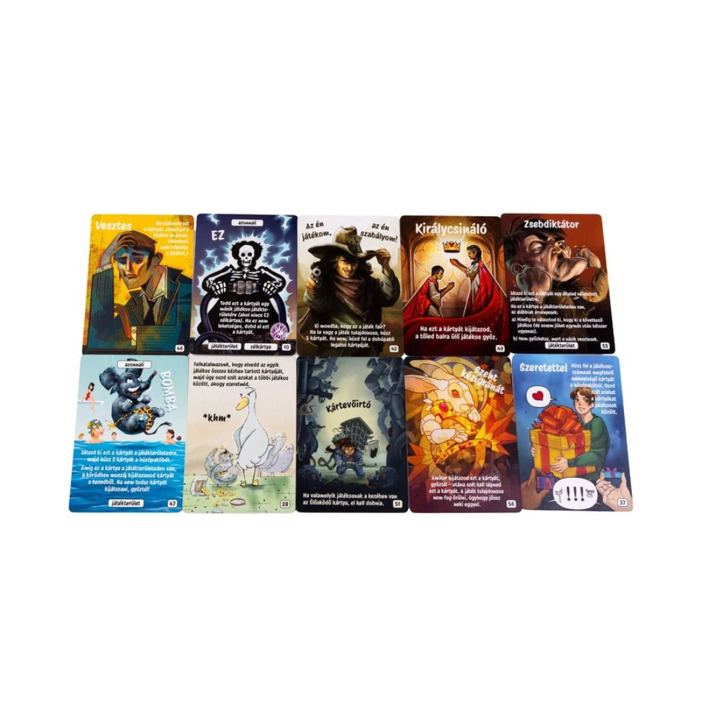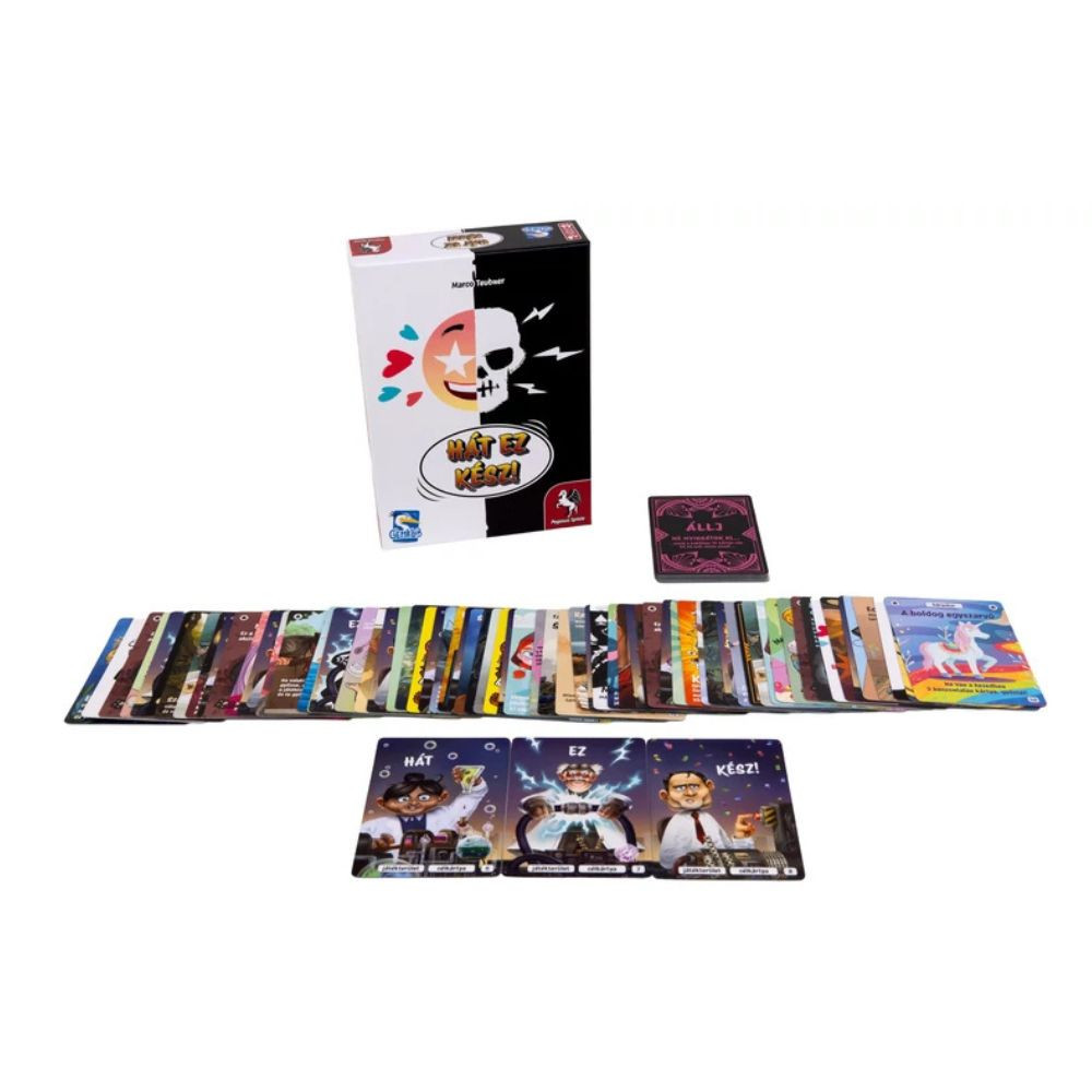 A Hát ez kész! az a kártyajáték, ahol a logika csak vendég, a káosz pedig házigazda. Már az első percben egyértelművé válik, hogy itt semmi sem az, aminek látszik: a kártyák új szabályokat teremtenek, a régieket felülírják, és minden játékosnak más percepciója lesz arról, hogy éppen ki is áll nyerésre. A rózsaszín elefánt, a Szent Kézigránát vagy a zsebdiktátor csak néhány azok közül a meglepetések közül, amelyek garantáltan fejre állítják a játékmenetet.