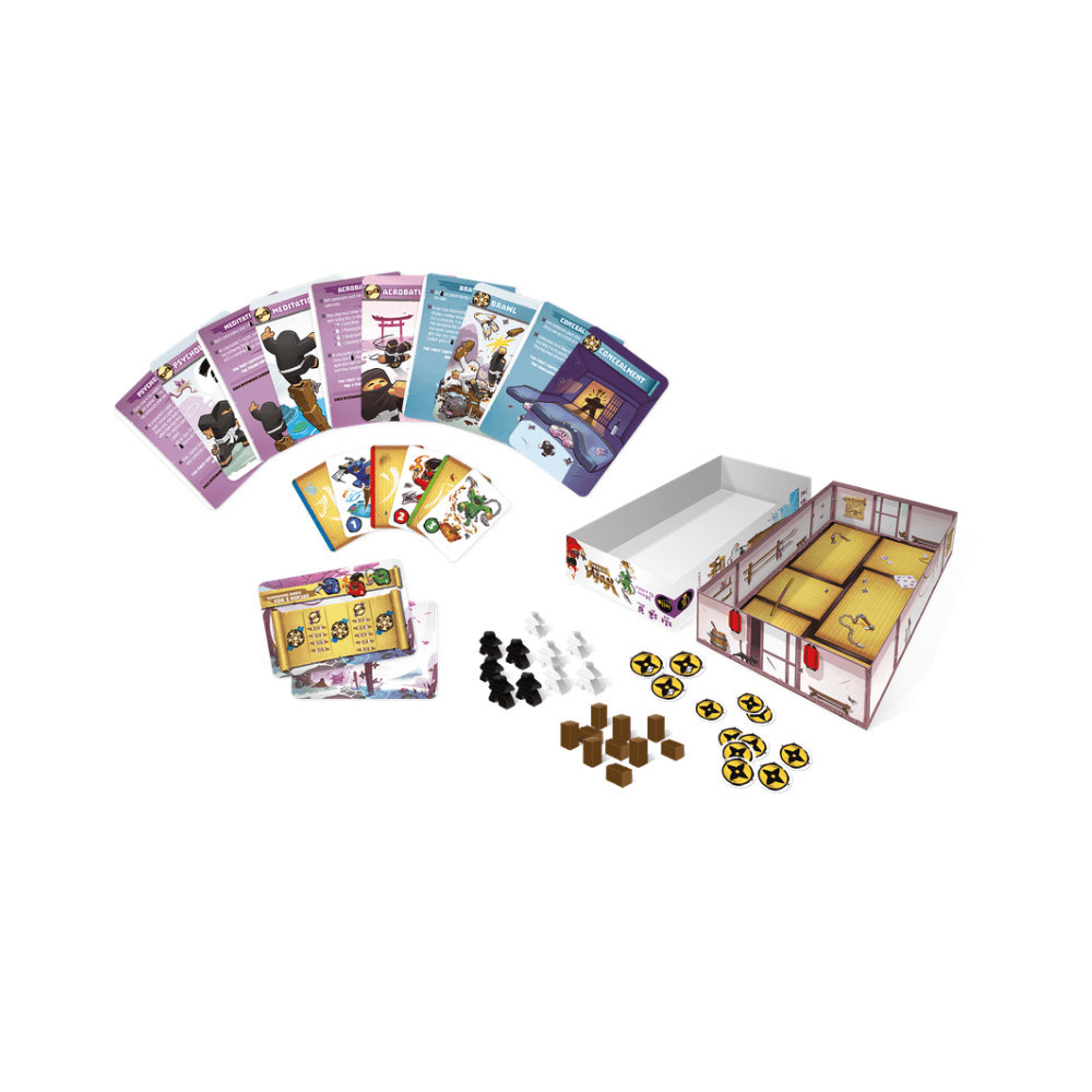 Légy te a legjobb ninja tanonc! Fejleszd képességeidet a Ninja Akadémián és bizonyítsd, hogy te vagy a leggyorsabb, legerősebb, legokosabb és a legjobb koncentrációjú ninja. Állj ki a kihívások sorozatára, és mutasd meg, hogy képes vagy helytállni a változatos próbatételek során, akár egyénileg, akár csapatban versenyzől társaiddal. Néhány példa a kihívások közül: egyensúlyozz minden ujjadon egy ninja meeplet, találd ki ellenfeled mennyi ninja meeplet helyezett a dobozba pusztán a rázkodás alapján, vagy légy a leggyorsabb aki öt farönköt egymásra állít. Itt az ideje bizonyítani, hogy erős vagy, és miközben pontokat gyűjtesz, légy stratégiában is gyakorlott, amikor fogadsz a párbajok nyerteseire!