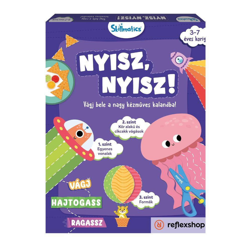 Melyik szülő ne ismerné azt a féltő pillanatot, amikor a kisgyereke először vet szemet a papírvágó ollóra? A Skillmatics Nyisz-nyisz! készlettel ez a fontos fejlődési mérföldkő nem egy izgalmakkal teli kísérlet, hanem egy vidám, sikerélményekkel teli és teljesen biztonságos alkotói folyamat kezdete lesz. Ez a kifejezetten 3 és 7 év közötti gyermekeknek tervezett fejlesztőcsomag játékos formában, lépésről lépésre vezeti be a kicsiket a vágás művészetébe. A dobozban található speciális, gyermekbarát biztonsági olló úgy lett kialakítva, hogy csak a papírt vágja, így a szülők nyugodtan hátradőlhetnek, miközben a kis felfedezők felfedezik saját ügyességüket.