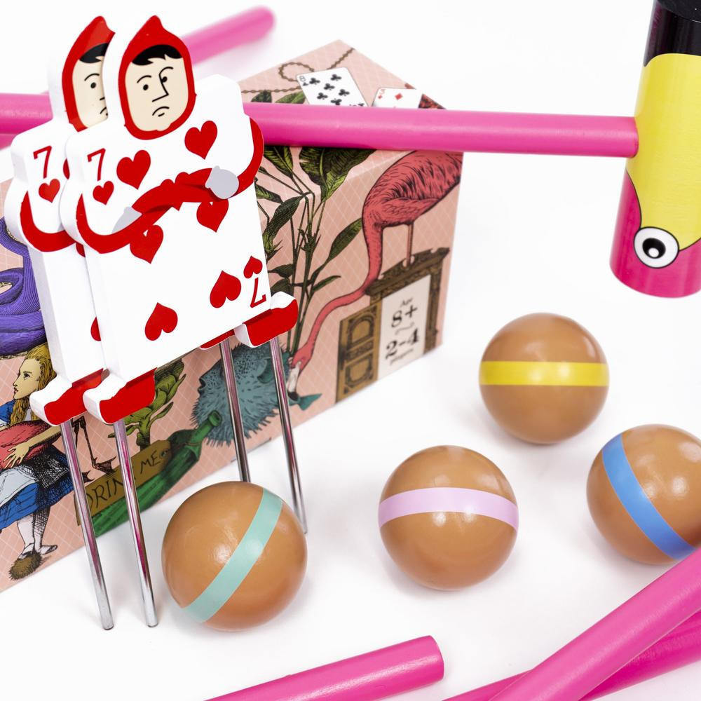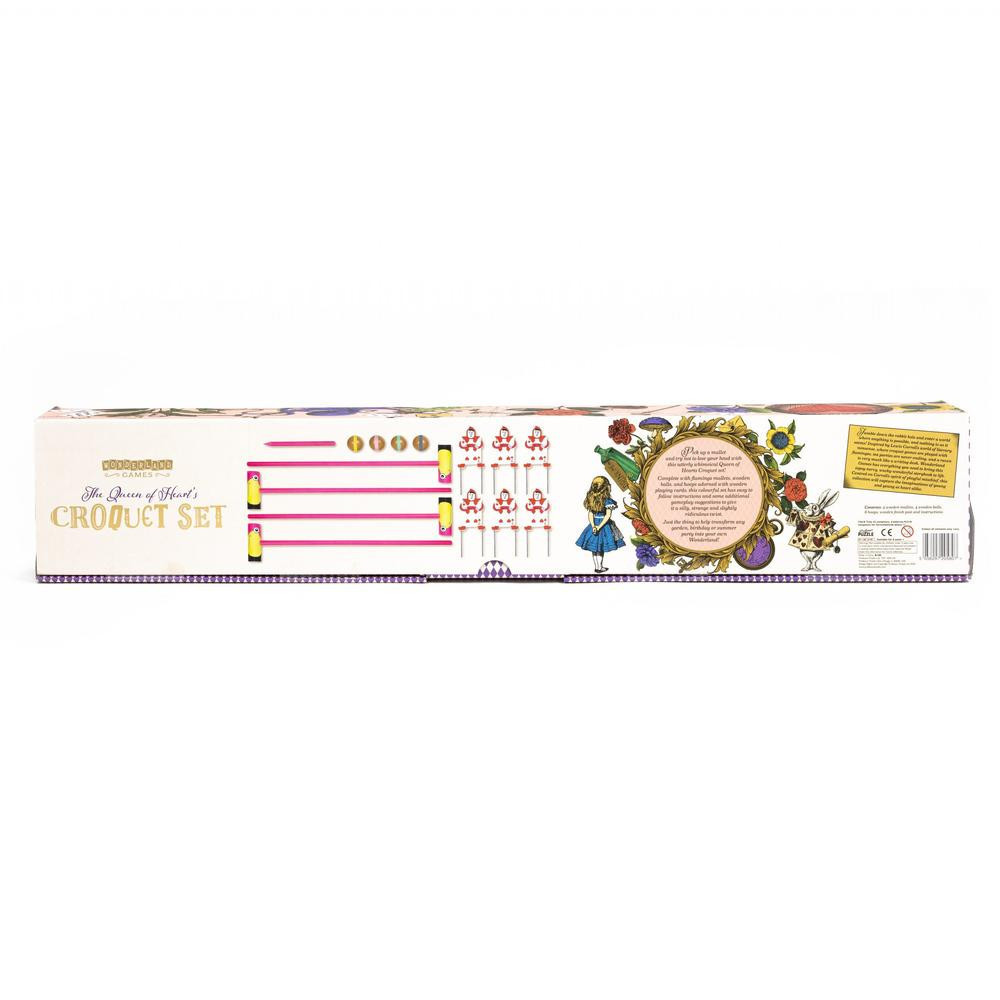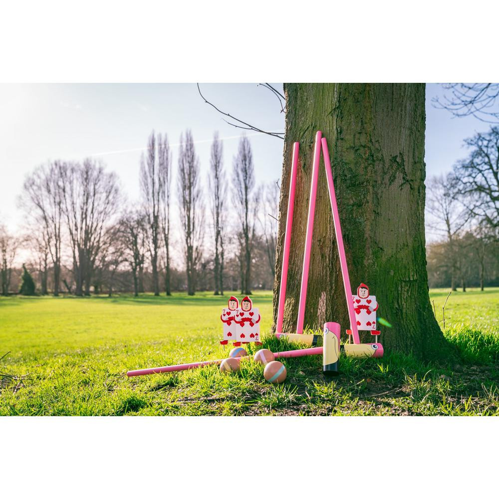 Az Alice in Wonderland: Queen of Hearts Flamingo krikett szett a szabadidő szerelmeseinek készült. Állítsd fel saját szetted és kezdődhet a verseny! Ragadjatok egy-egy fa kalapácsot, és próbáljátok megőrizni hidegvéreteket a Piros Királynő krikett játékában. A szett tartalmaz flamingó mintázatú kalapácsokat, fa krikett labdákat, és kapukat minden játékos számára. Egy színes szabadidős party játék, amely könnyen irányítható és gyorsan megérthető, legyen szó bármilyen nehézségi szintről. Tökéletes választás, hogy elmerülj Csodaország világában.