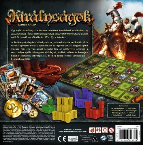 A Királyságok társasjáték egy izgalmas és pörgős taktikai játék, amelynek során a játékosok rivális uralkodókként vetélkednek az erőforrásokért és a befolyásért. A játék három fordulóból áll, amelyek során a játékosok várakat építettek és területlapkákat helyeztek el a táblán. A lapkák értékelése után a játékosok pontokat szereznek azokból a sorokból és oszlopokból, amelyekbe tettek várat.