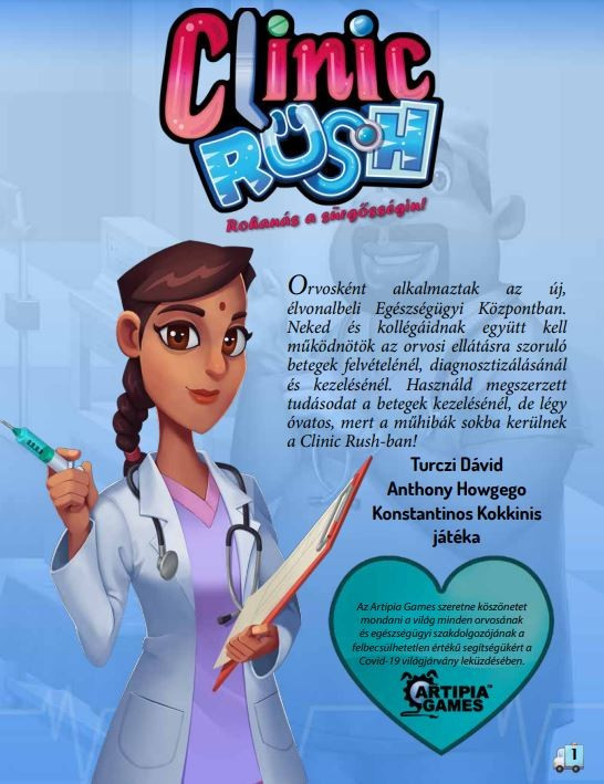 A Clinic Rush egy innovatív, valós idejű, kooperatív társasjáték, amely az orvosi szakmák kihívásokkal teli és nagy nyomást jelentő természetét szimulálja. A játékosok a homokórákat dolgozóként használó munkáselhelyezési mechanizmus segítségével számos műveletet hajthatnak végre. Egy rendkívül tematikus élmény, amely a játékosok és a családok számára egyaránt lebilincselő, tele szórakoztató kihívásokkal és éles döntéshozatallal! Nagy a nyomás, hiszen emberi életek vannak a kezedben! Megbirkózol a rohanással, doktorok?