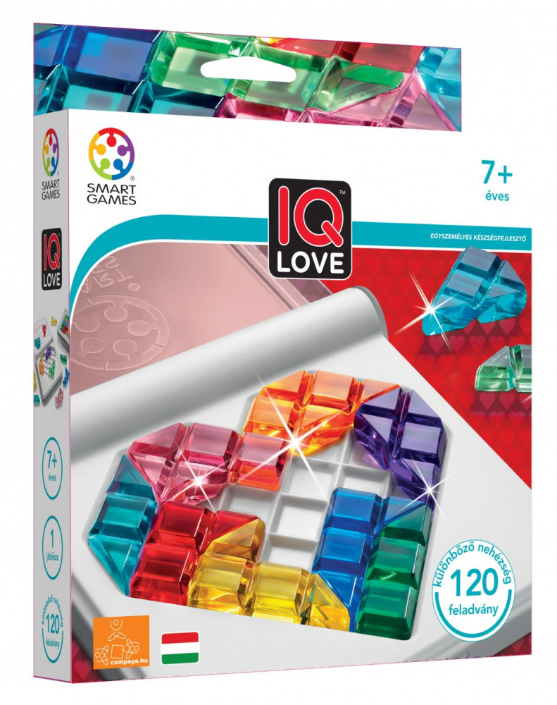 Az IQ Love egy okos játék a Smart Games-től, amelynek célja, hogy a játékosok megfelelően helyezzék el az összes darabot a játéktáblán. A játék kétoldalas játéktáblával rendelkezik, és 120 kihívást tartalmaz, amely garantálja a hosszabb játékidőt.