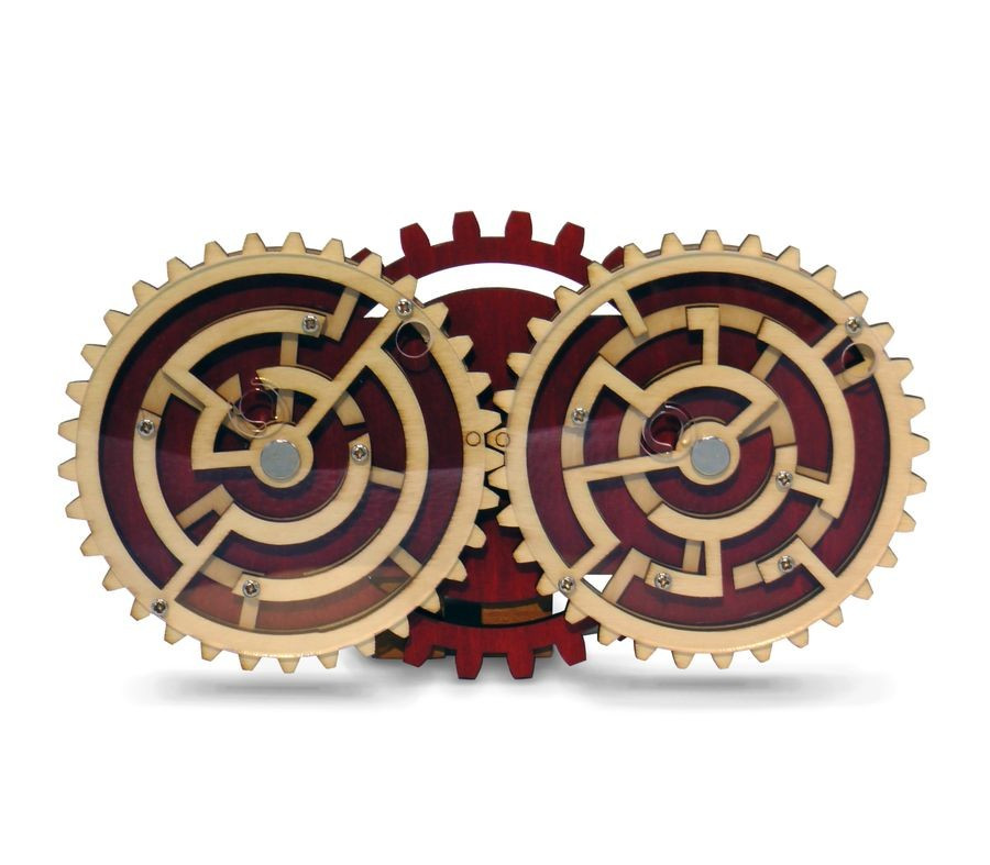 Két labirintus, két golyó. Mindkét oldal megoldását egyszerre kell megtalálnod, hogy kiszabadítsd őket! A két labirintust fogaskerekek kapcsolják össze, nem árt tehát odafigyelni: ami az egyik golyót közelebb viszi a kijárathoz, a másikat talán messzebb juttatja...