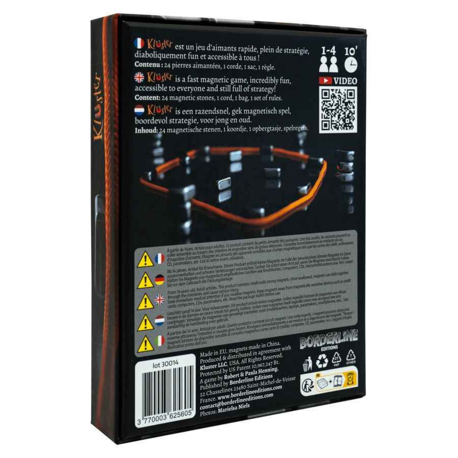 A Kluster S mágneses társasjáték igazi üdvöskének számít minden korosztály számára. A játék rendkívül könnyen tanulható, így garantált a jó hangulat és a szórakozás. A játék célja, hogy a játékosok megszabaduljanak a mágneses köveiktől, mielőtt a többieknek sikerülne. A játék nagyon rövid, így bárhol és bármikor játszható, akár utazás közben is.